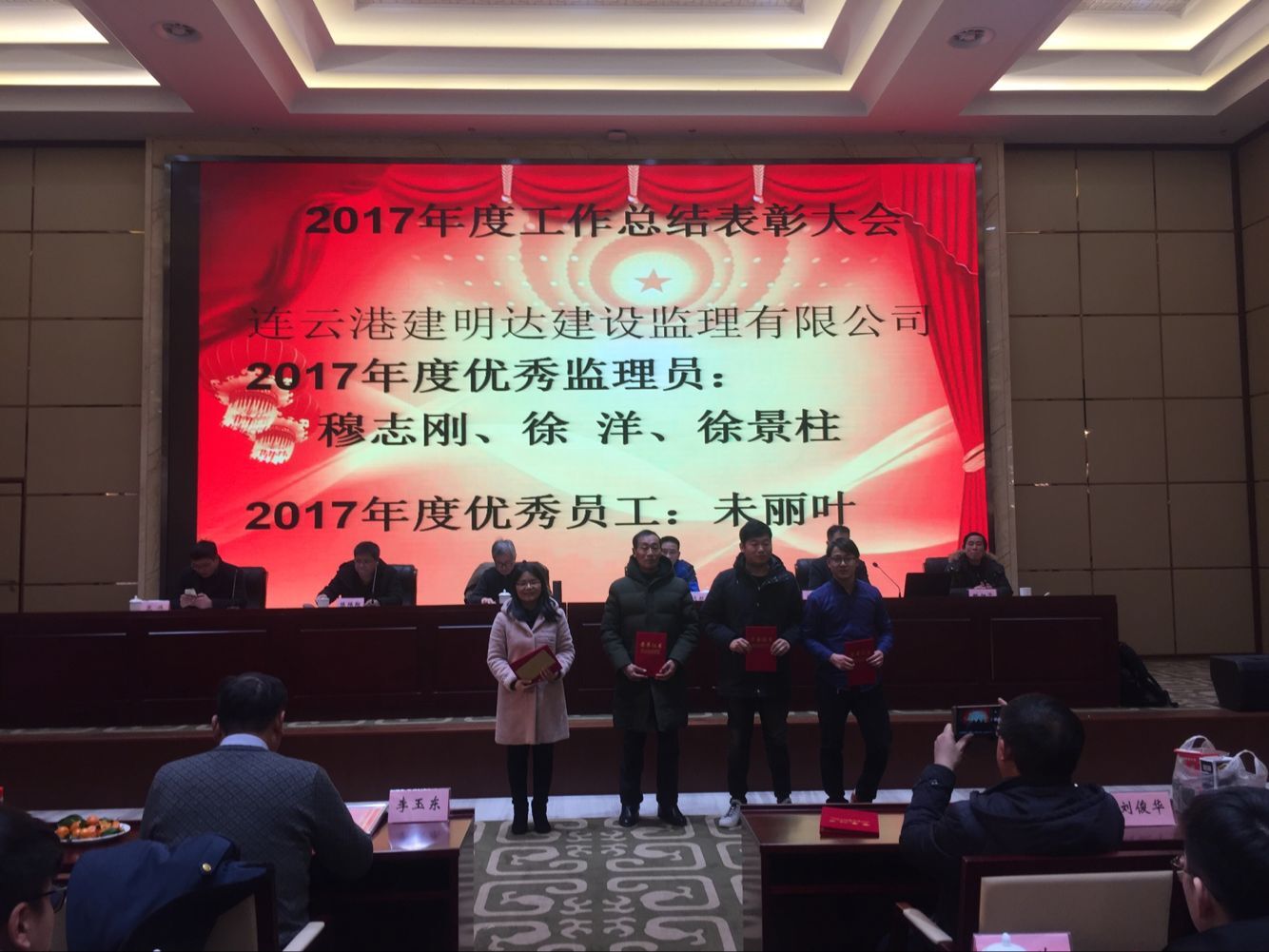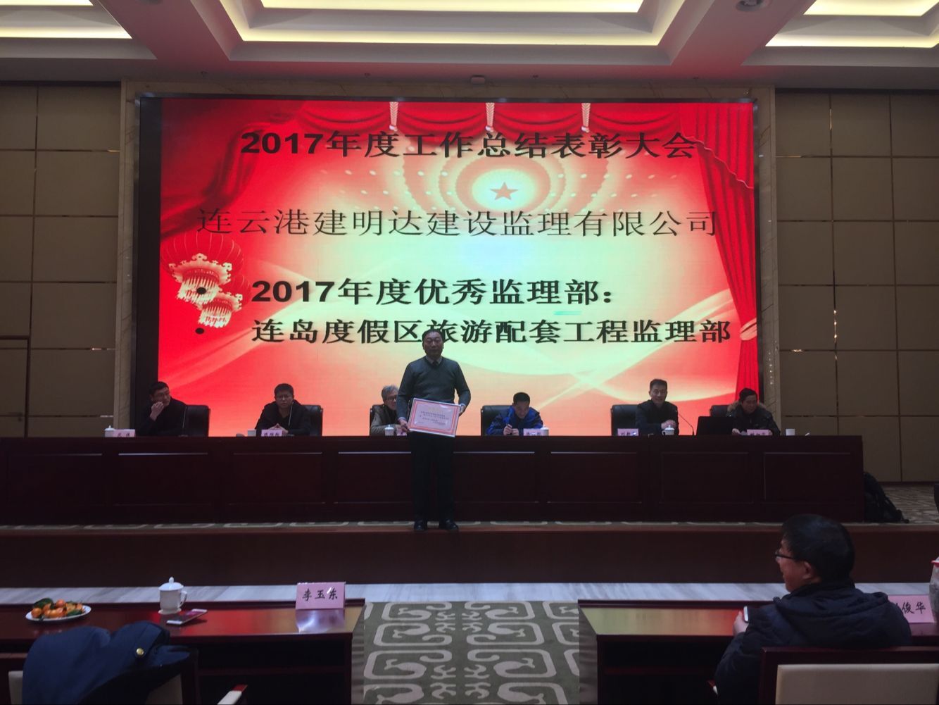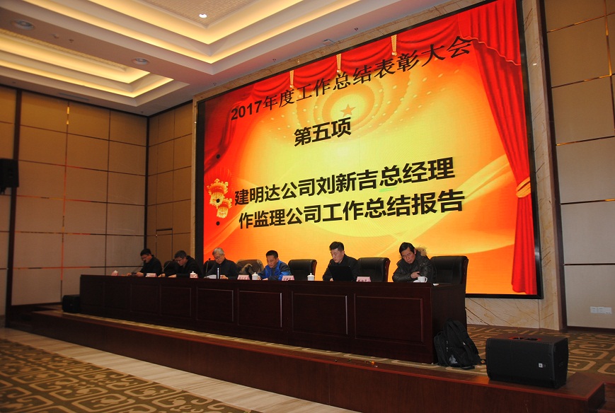 下午五點(diǎn),2017年工作總結表彰大會(huì )在溫泉大酒店會(huì )議中心準時(shí)召開(kāi)??偣径聲?huì )領(lǐng)導李清洋、王家松、徐遠航,君怡景觀(guān)公司總經(jīng)理,建明達監理公司總經(jīng)理劉新吉,建明達監理公司總工姚加千,各職能部門(mén)經(jīng)理、各項目總監及全體員工參加了大會(huì )。