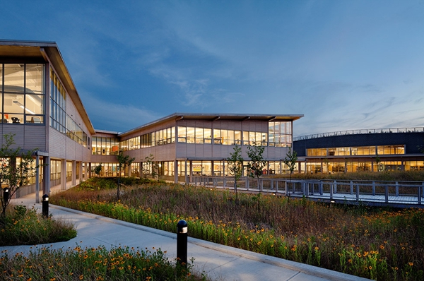 靈感來(lái)源于學(xué)校的地形、水紋系統和環(huán)境。建筑和屋頂花園位于斯坦福市的最高點(diǎn),連綿的綠色大屋頂下方是體