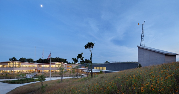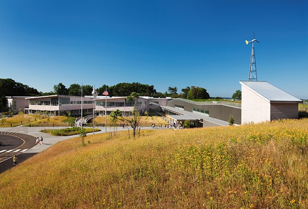 境:為學(xué)校設計的大型、密集的綠色屋頂;可以展示自然過(guò)濾過(guò)程的生態(tài)花園;雨水收集系統和展示“自由能源”的