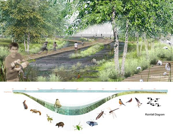 濾處理。處理過(guò)的雨水再通過(guò)“水庫”流回建筑進(jìn)行消毒,再經(jīng)過(guò)循環(huán)系列流入河道,蜿蜒地穿過(guò)濕地,在河道的下
