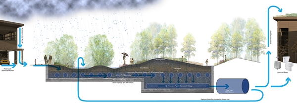 影響;處理項目中所有通過(guò)不透水的地表流出的雨水)2.雨水管理策略也被設計為項目的節水目標(收集和重用雨水),