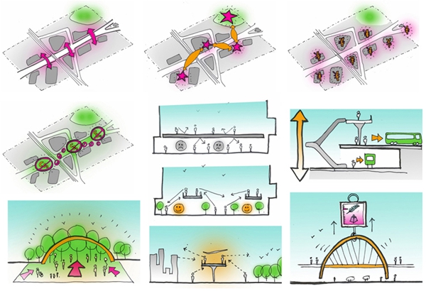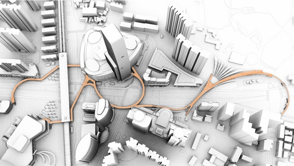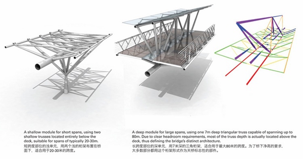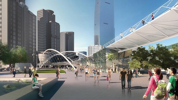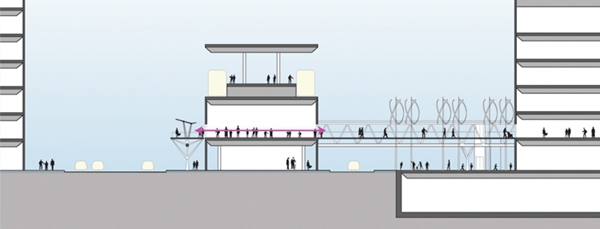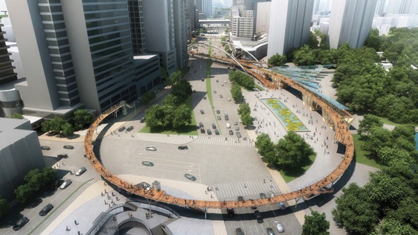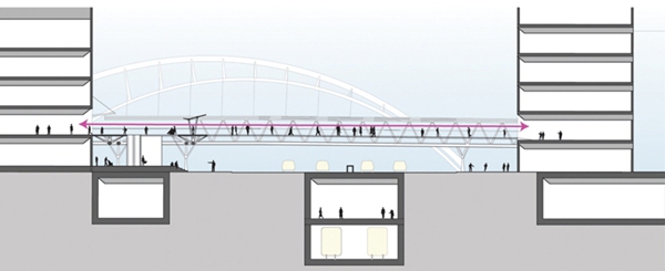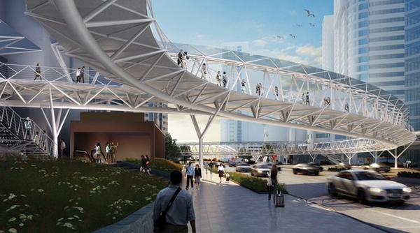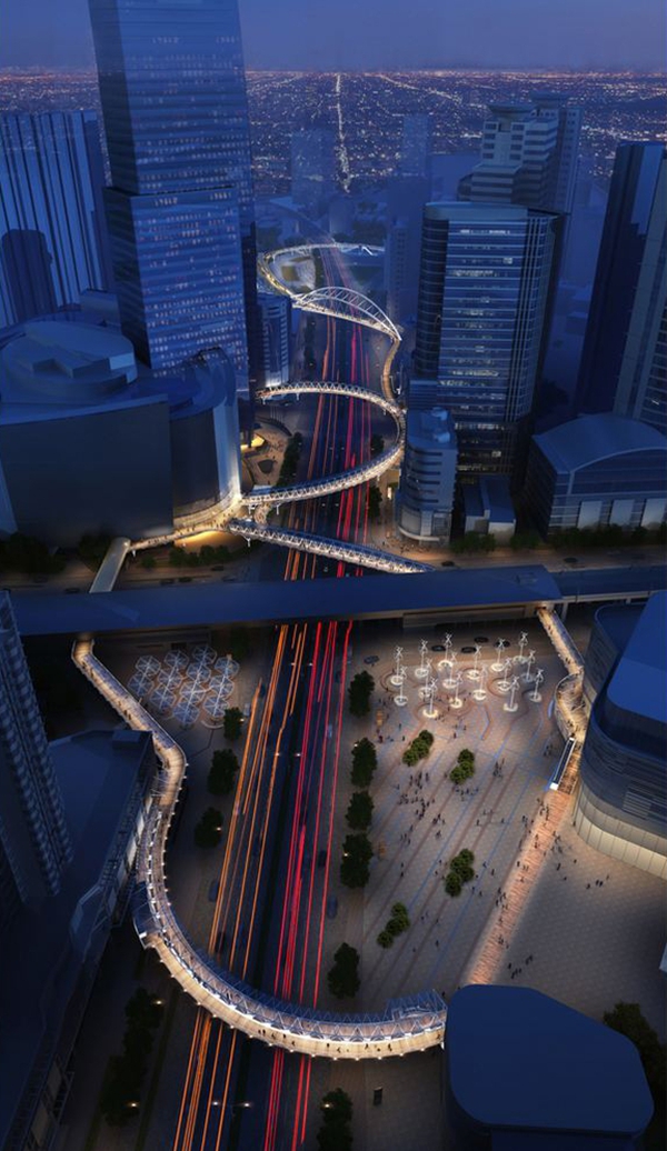 龍之翼是一個(gè)長(cháng)達1.5公里的空中步行系統,包含一個(gè)空中廣場(chǎng)和一組跨度70米的桁架,貫穿上海中山公園地塊最繁華的購物區。Arup Associates是該項目國際競標的優(yōu)勝者,設計的主旨是打造一個(gè)天橋及空中平臺,不僅將高密度商業(yè)中心串聯(lián)起來(lái),同時(shí)解決該地區繁雜的公共交通問(wèn)題。這個(gè)系統連接了兩條地鐵線(xiàn)、多個(gè)購物中心和中山公園前廣場(chǎng)。設計團隊認真開(kāi)展了實(shí)地分析和行人流量研究,從使用者的角度出發(fā),充分考慮可達性和無(wú)障礙設計,將此核心商業(yè)區打造成一個(gè)方便行人活動(dòng)的區域。