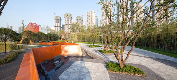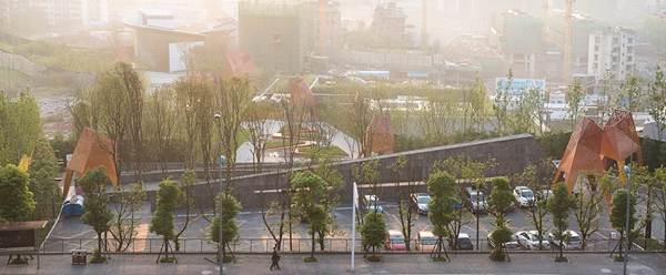 綿延的山峰、四川盆地的山谷、水稻梯田、蜿蜒的長(cháng)江和重慶灰白薄霧彌漫的神秘天際在公園周?chē)纬闪司薹淖匀槐尘?,建立了強烈的視覺(jué)聯(lián)系。