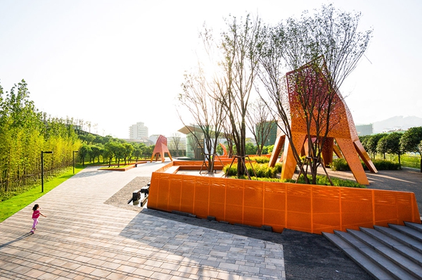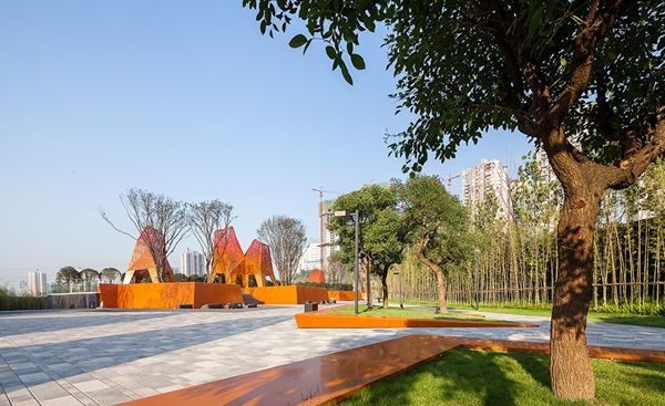 設計師從這些元素中汲取靈感設計了亭閣、“Z”形小道、公園地形,及與天空色對比的鮮艷色調。