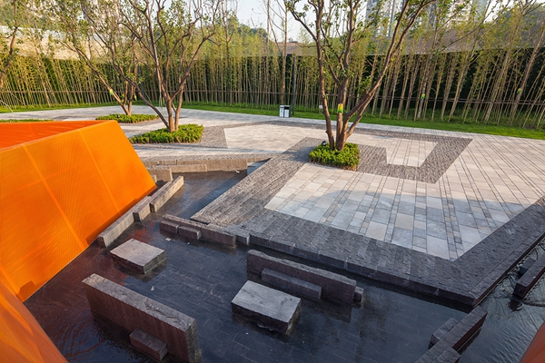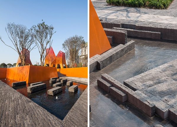 從廣場(chǎng)一直流向銷(xiāo)售中心的水元素是鳳鳴山公園的重要部分。設計師采用了水渠、水池、噴泉等不同的水景效果,不僅起到降溫的作用,潺潺的流水聲和水景營(yíng)造出的氛圍更是為游人展示了一道迷人的風(fēng)景。