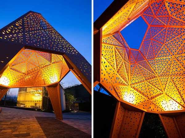 從楓溪路到達公園,入口處排列的舞動(dòng)的紅色和橘色雕塑將游客引向廣場(chǎng)停車(chē)場(chǎng)。第一個(gè)亭子設在入口處,隨著(zhù)亭閣沿山坡一路向下,可以看見(jiàn)延綿不絕的山峰。每個(gè)亭閣都沿著(zhù)“Z”形小道精心布置,將人行步道引向下方的“山巒”,最終到達萬(wàn)科銷(xiāo)售中心區域。白天,亭閣灑下陰涼;夜間,被燈光點(diǎn)亮的亭閣則變身為絢爛的“燈籠”。