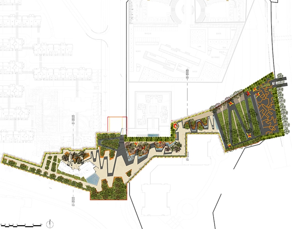 高差明顯的特殊地形為人行步道的設計帶來(lái)挑戰,但同時(shí)為從上部停車(chē)場(chǎng)到最底層售樓中心的汽車(chē)通道提供了便利,形成一道獨特的“山形”動(dòng)態(tài)景觀(guān)。