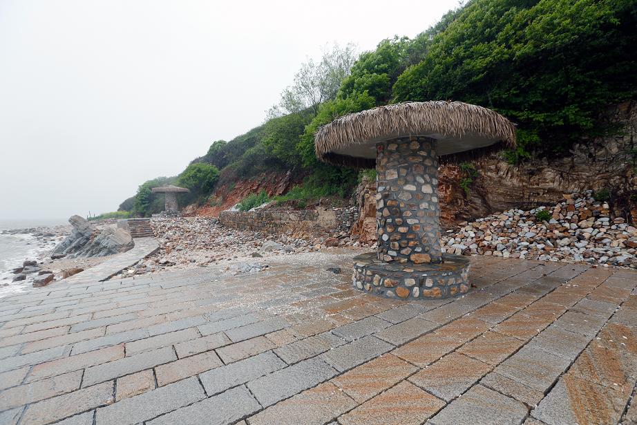 神路廣場(chǎng)北側休息平臺,原為破損漁民生產(chǎn)用房。設計保留房子基礎,改造成觀(guān)景平臺,平臺上設計休憩構架。